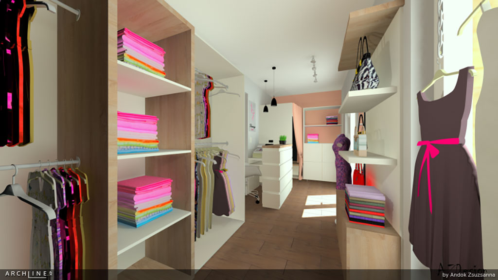 "Megbízóm azzal keresett meg, hogy tervezzem meg a 2x6,2 méter alapterületű felújításra váró helyiséget női divatáru boltnak. Fő szempont a nőies megjelenés és helyiség méreteihez viszonyítva rengeteg tárolóhely, illetve próbafülke és pult kialakítása volt. Az ARCHLine.XP programmal szép, igényes látványtervek készültek, illetve a teljes dokumentáció is: méretezett alaprajzon kívül berendezési alaprajz, villanyterv, falnézetek -bútorterv, berendezéslista.