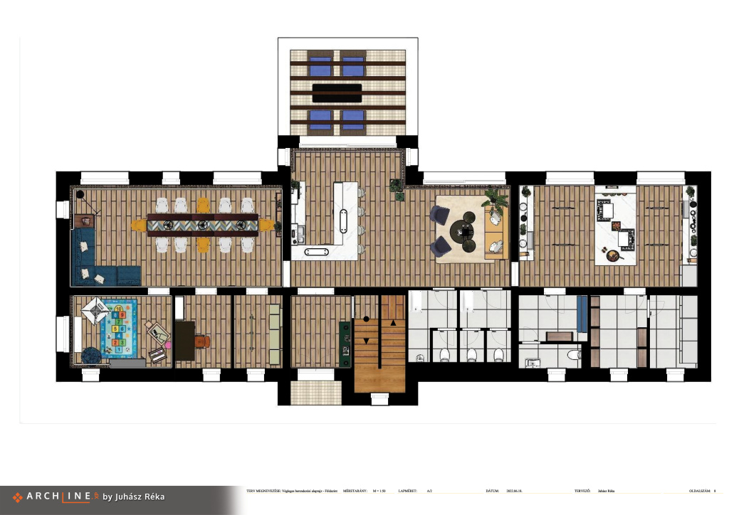 A családiház lakóterének tervezésnél figyelembe kellett venni, hogy a megrendelő Lívia étteremvezető és szeretne a saját otthonukban egy különleges lakáskonyhát létrehozni. A nagy méreteknek köszönhetően a földszinten került elhelyezésre a lakásétterem és az emeleten pedig a lakásrész. A térszervezésre nagyon sok lehetőség volt és a meglévő falak közül csak azok maradtak meg, amelyek statikai szempontból szükségesek. Így elértem azt, hogy minden igényüknek megfelelő tér legyen kialakítva.