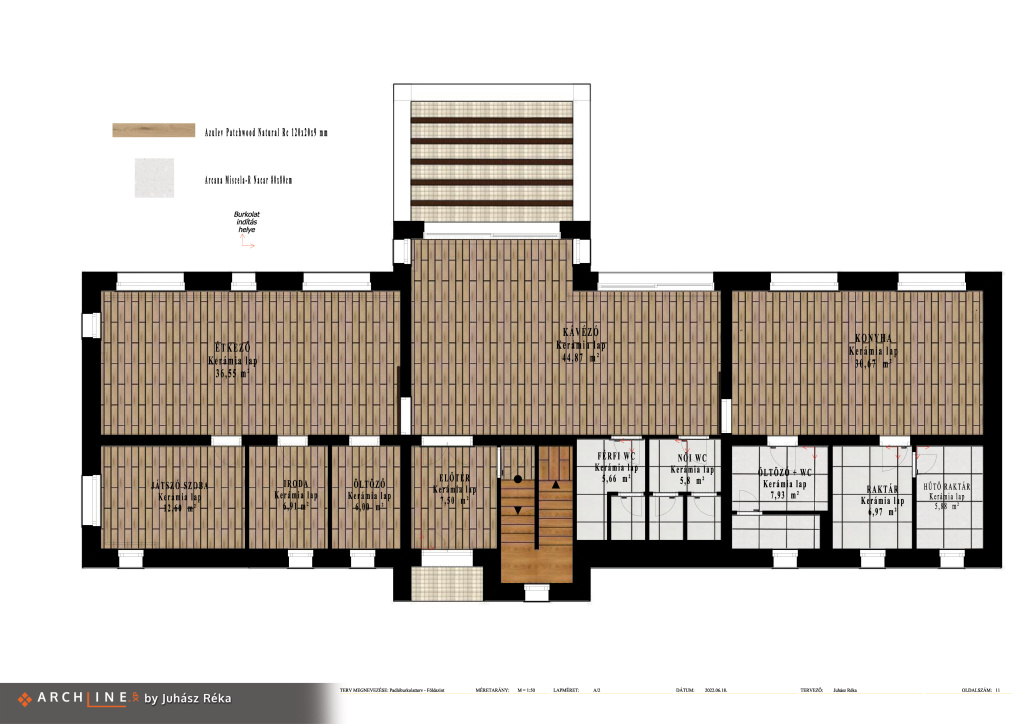 A megrendelőm Lívia nagyon szereti az ArtDeco stílust, de szerette volna ha modernebb lesz az étterem és, hogy csak 1-1 elem utaljon a stílusra. A színek között itt is a kék dominál és a sárgával, zölddel kombinálva egy otthonos meleg légkört alakítottam ki a kávézó és az étkező részre. A konyában egyszerű, letisztult színeket használtam, hogy az elkészült étel kreációk tudjanak dominálni. A márvány mintás munkapult és a fa konyha bútor nagyon kellemes otthonos érzést kell, mellette pedig nagyon elegáns is egyben. Minden helyiségben a nagy vendég forgalom miatt porcelán lapokat választok, a könnyebb takaríthatóság érdekében. A közösségi terek, mint az étkező, kávézó, konyha és gyerek játszószoba fa mintás járólapot kapott, mellyel még inkább az otthonosságra törekszem. A mosdó helyiség és a raktárak pedig egy nagyon szép világos szürke padlóburkolatot kaptak.