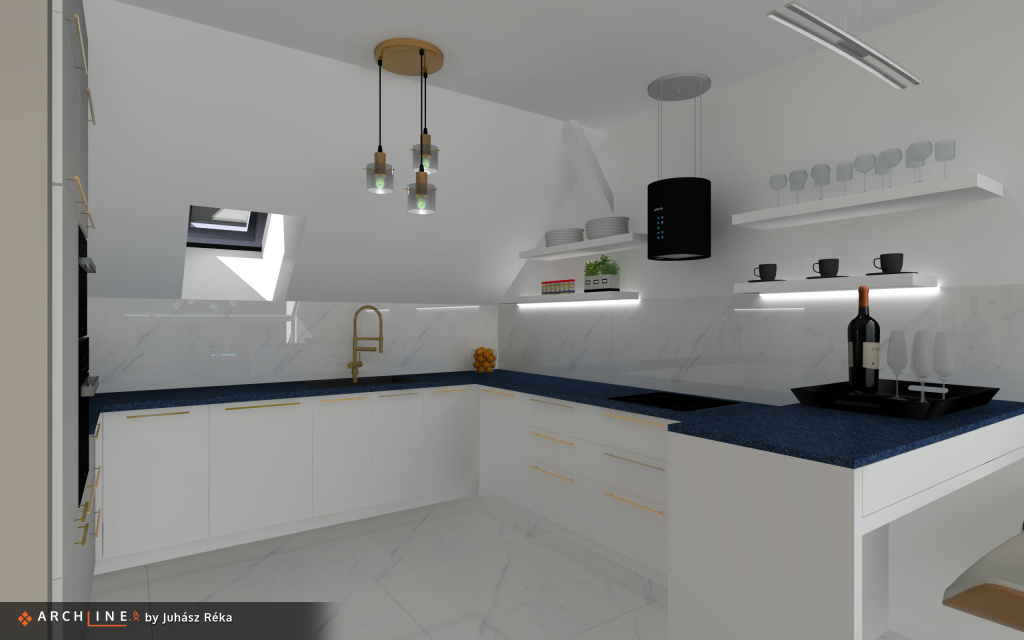 Az egyedi építésű családi ház tereihez igazodva, a cél a tágas tér kialakítása és megtartása, melyet többek között az egységes burkolatok és színhasználat segítségével értünk el. Fontos szempont volt a megrendelőinknek, hogy az Art Deco stílus megjelenjen, de mindezt modern stílusban és a jelenlegi kor igényeinek megfelelően. Amerikai konyhás nappali világos, tágas térben kerül elhelyezésre. Egy fürdőszoba kerül kialakításra és egy vendég wc. Sok tárolásra alkalmas hely van a mosókonyhába és az előszobába is egy nagy méretű egyedi tolóajtó szekrény kerül, ahol nem csak az aktuális kabátok, cipők férnek el, hanem akár az összes. Kérés volt még egy design bútor elhelyezése, Mathieu Matégot hamutartó, mely nagyon kedves ajándék volt az apuka számára. Bár nem dohányoznak a családban, de nappaliban megfelelő helyet találtunk neki. Lívia és Gergely gyakran szoktak baráti összejöveteleket tartani, ahol a főzés is előtérbe kerül. A konyhában ezért sok praktikus tárolóhely került kialakításra, de mivel a vendégeket is sokszor saját éttermükben fogadják ezért itt főként a szűk családra terveztem. Mivel Gergelynek informatikai vállalkozása van, ezért otthon is szokott dolgozni, így neki kialakításra került egy dolgozószoba az emeleten. A korszerű világítás megtervezésénél figyelembe kellett venni, hogy az ingatlan mindkét szintjén mennyezet fűtés található, így egy-egy hangsúlyos mennyezeti lámpa és több helyen pedig fali lámpák kerültek betervezésre.