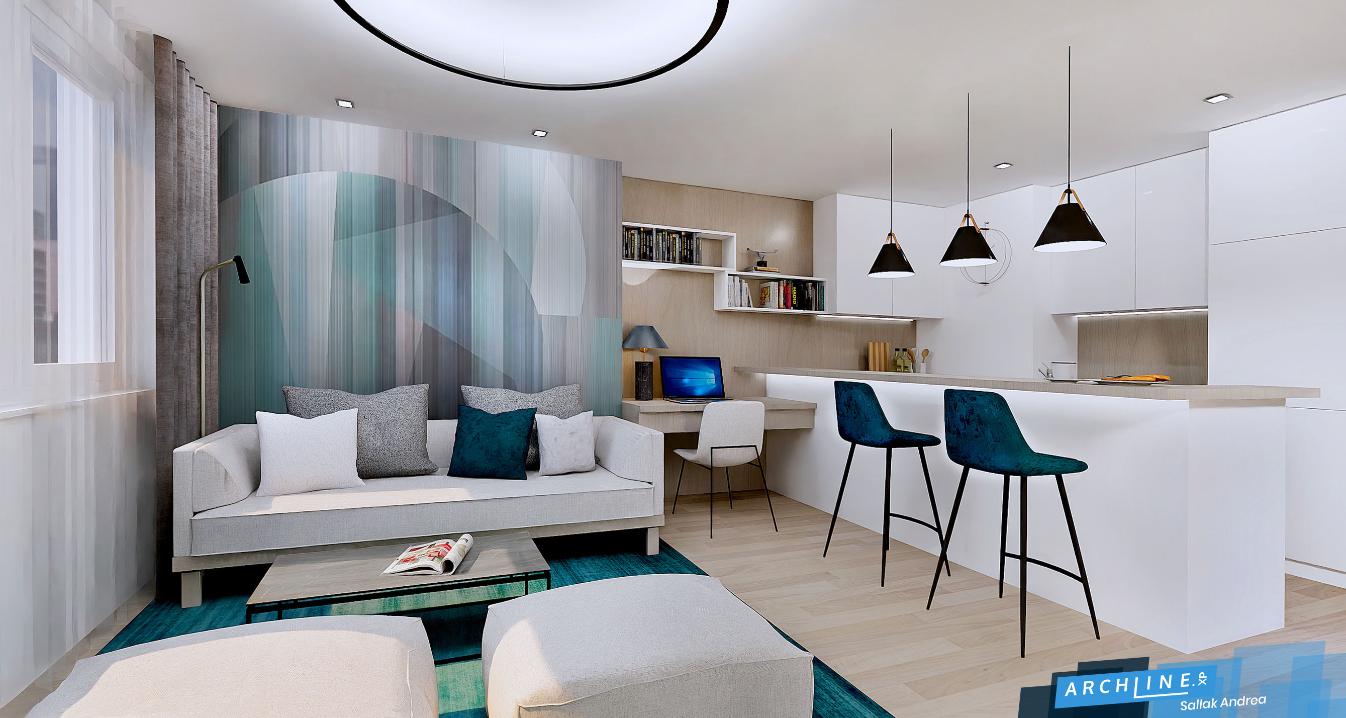 A lakás egy budapesti társasházban található, egy közös nappali-konyhából, egy hálószobából, egy kis fürdőből áll. A lakás jövőbeli sorsa még bizonytalan, valószínű, hogy egy egyetemista fiú lakja majd, de az sincs kizárva, hogy kiadásra kerül. Ezt a tervezés során figyelembe kell venni, a tulajdonos azt kérte, hogy egy vagy két személy részére kényelmes legyen, a stílusát pedig fiatalosra, de inkább semlegesre hangoljam. Ennek köszönhető a kissé skandinávos anyagválasztás, a natúr fa, a sok fehér, és kiegészítésként a türkiz minden árnyalata, amit a nappali falára kerülő posztertapéta ihletett.